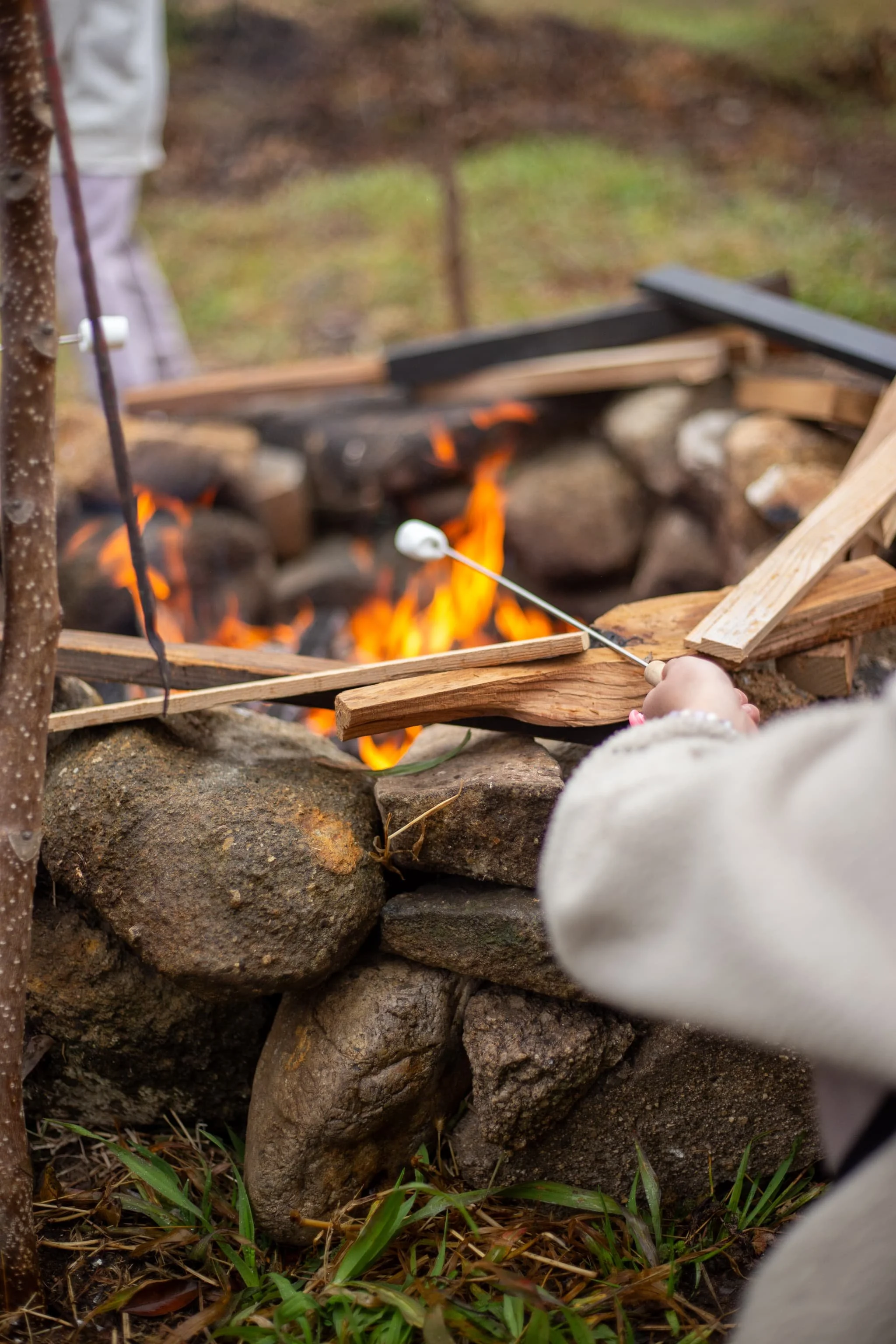 庭では焚き火を囲み、